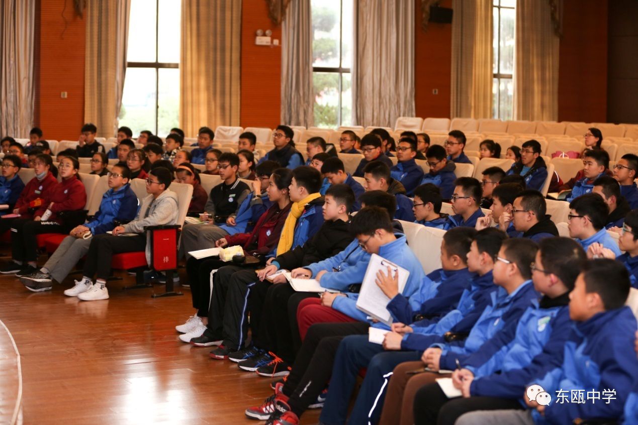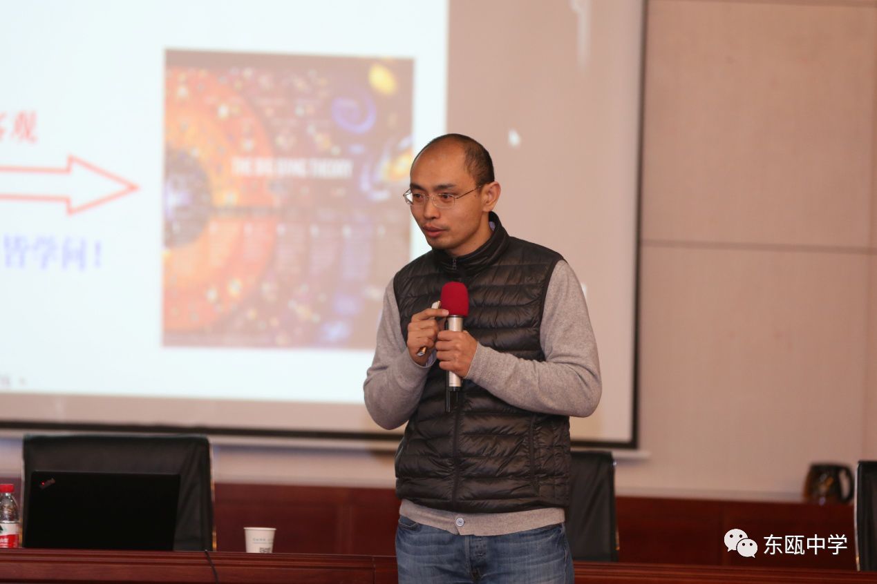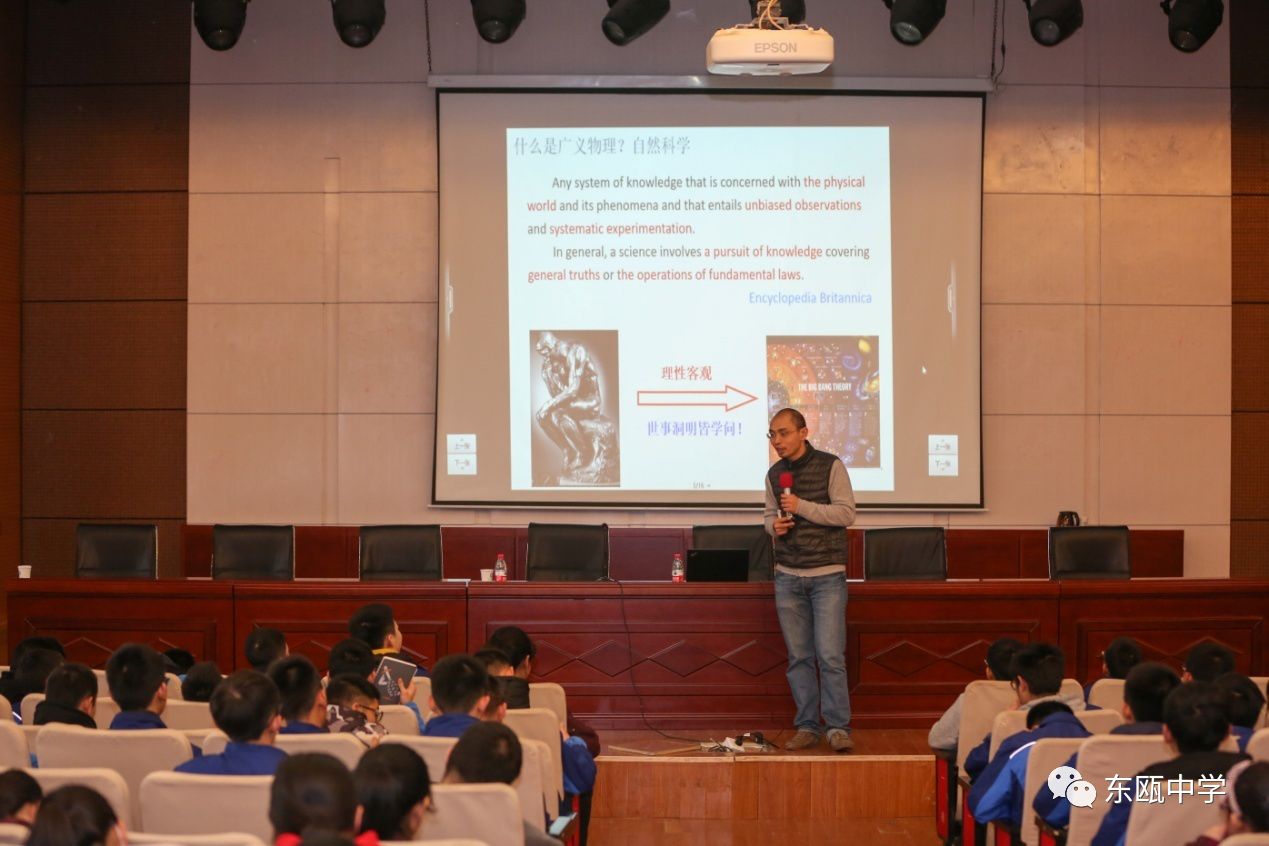 2018年1月19号下午,北京大学物理学院穆良柱教授风尘仆仆赶到温州东瓯中学,在学校报告厅为我校学生做了一场《什么是物理》的精彩专题讲座。东瓯中学副校长王振哲对穆教授的到来表示诚挚的欢迎和感谢,并与相关教师和现场同学一起聆听了讲座。
